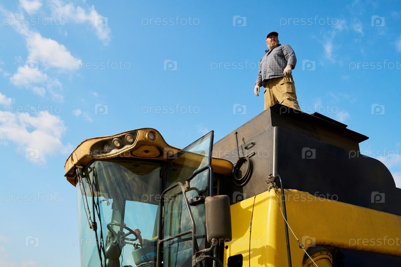 Мужчина средних лет стоит на вершине сельскохозяйственной машины на открытом воздухе