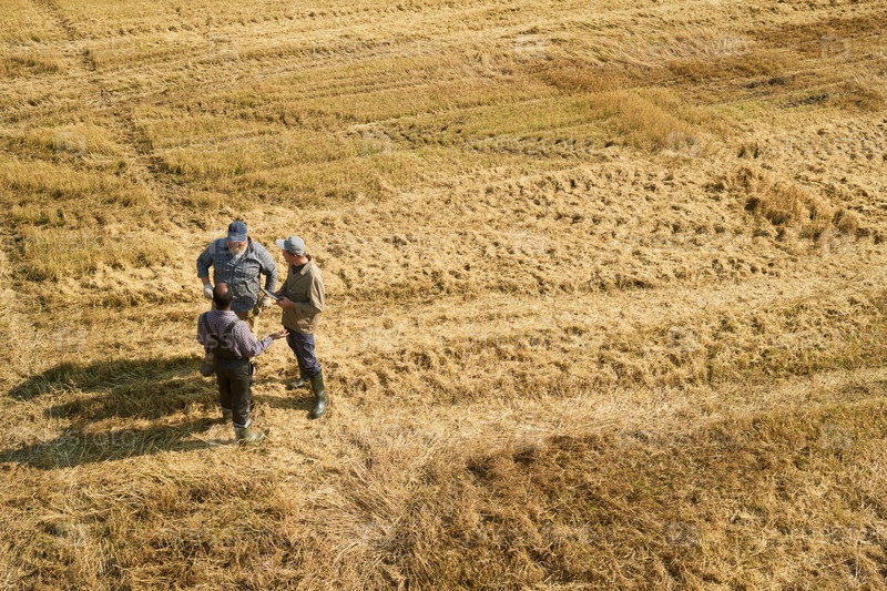 Группа мужчин, обсуждающих работу на собранном пшеничном поле