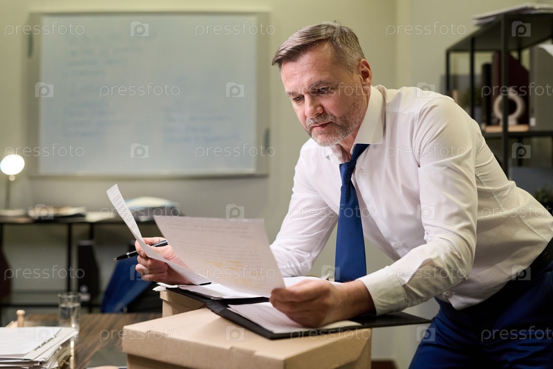 Мужчина средних лет просматривает документы, работая в офисе