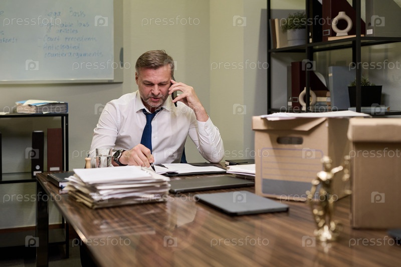 Мужчина средних лет работает за столом, разговаривая со смартфоном в офисе