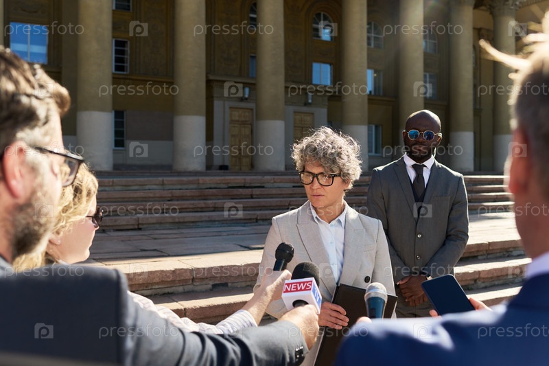 Женщина среднего возраста выступает на пресс-конференции в окружении репортеров