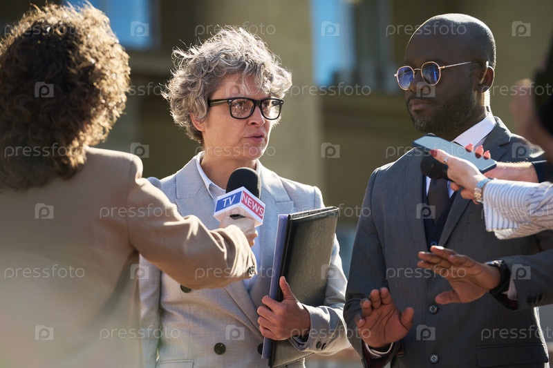Женщина среднего возраста дает пресс-релиз в окружении репортеров