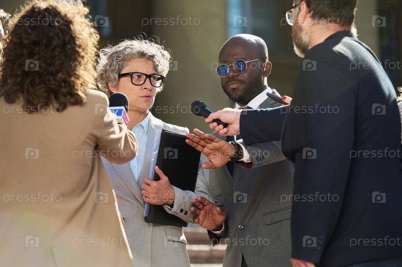 Женщина средних лет и чернокожий мужчина дают интервью журналистам снаружи