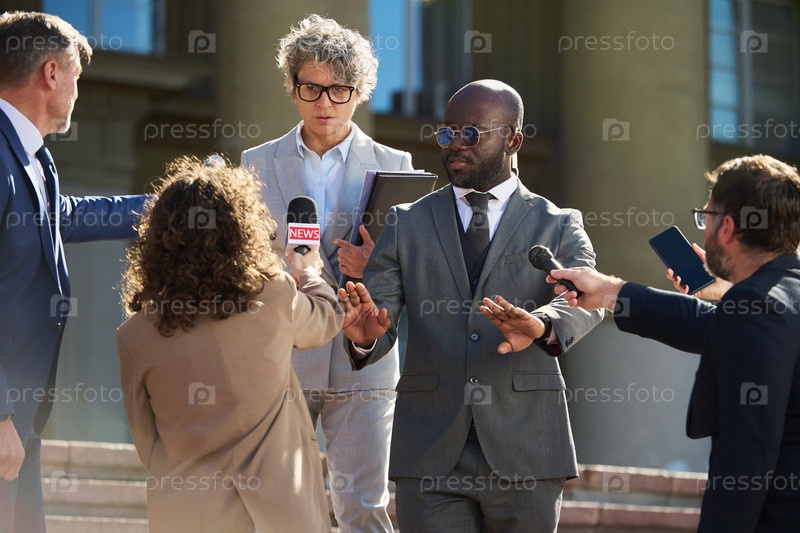 Мужчина средних лет и чернокожий мужчина покидают здание суда в окружении репортеров