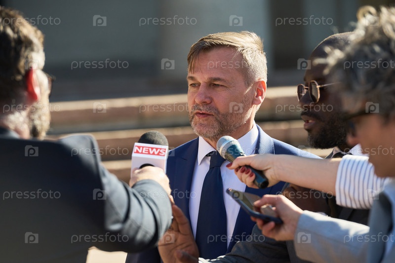 Мужчина средних лет отвечает на вопросы во время интервью для прессы в открытом воздухе