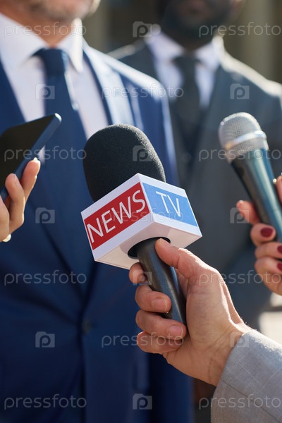 Мужчина средних лет дает интервью журналистам, держащим микрофоны