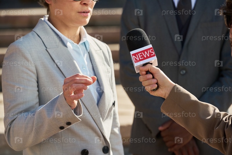 Женщина средних лет дает интервью журналисту, держащему микрофон