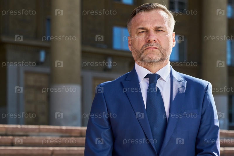 Портрет мужчины среднего возраста, стоящего на улице в костюме