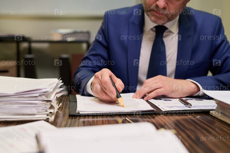 Мужчина средних лет просматривает документы и подписывает бумаги за рабочим столом