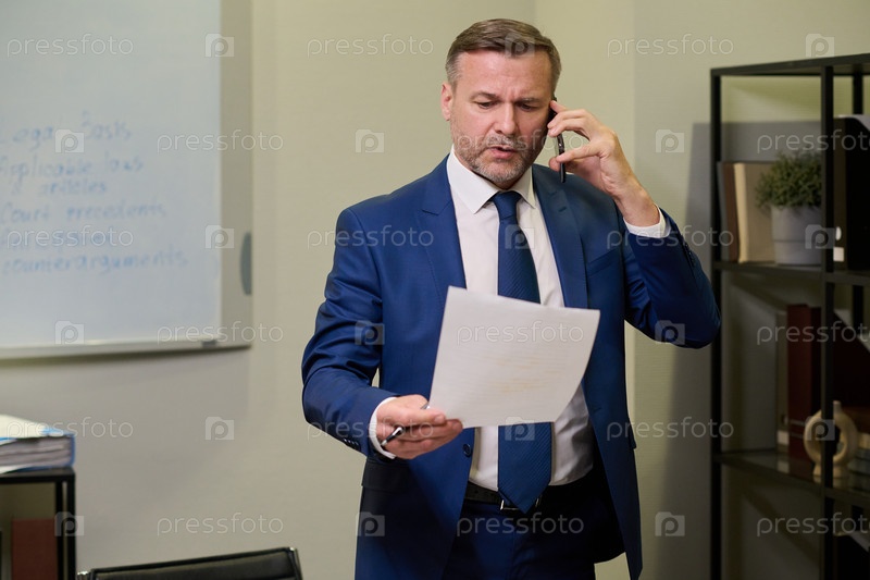 Мужчина средних лет просматривает документы, разговаривая со смартфоном