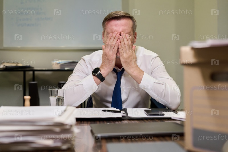 Мужчина среднего возраста сидит за рабочим столом, чувствуя стресс на работе