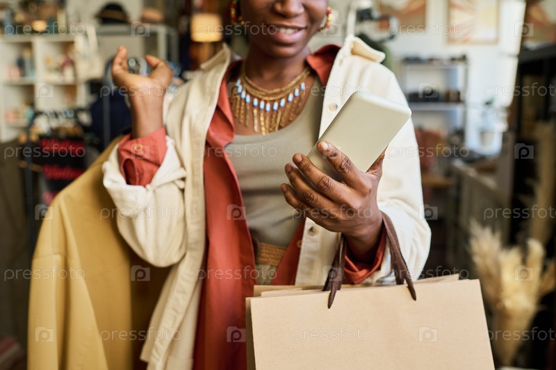 Молодая чернокожая женщина улыбается во время покупок и использования смартфона в магазине