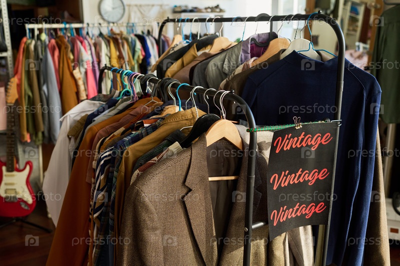 Стеллаж для одежды, демонстрирующий винтажные куртки и рубашки в конфиденциальном магазине
