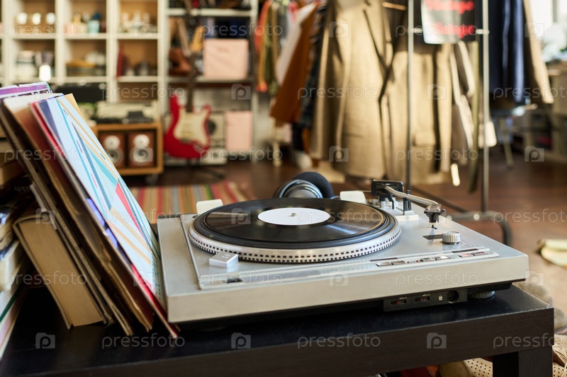 Vintage Turntable Playing Vinyl Record in Thrift Shop Окруженный одеждой