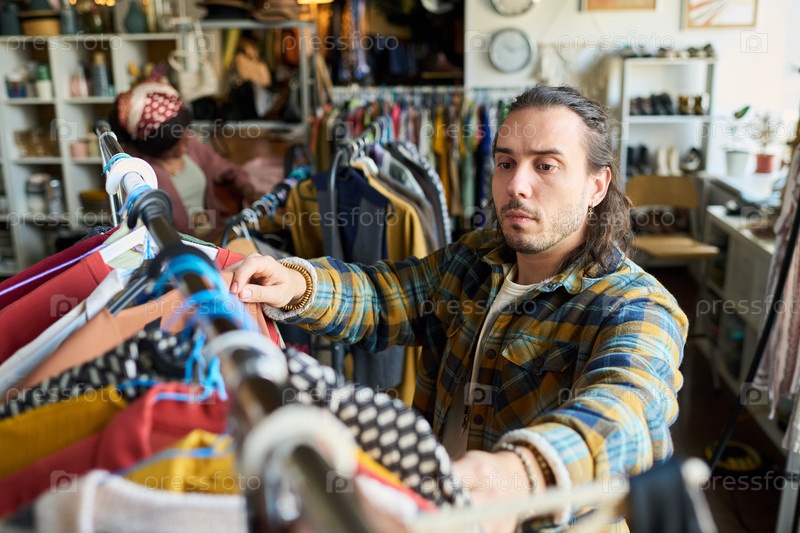 Молодой взрослый мужчина просматривает стеллажи для одежды внутри модного магазина