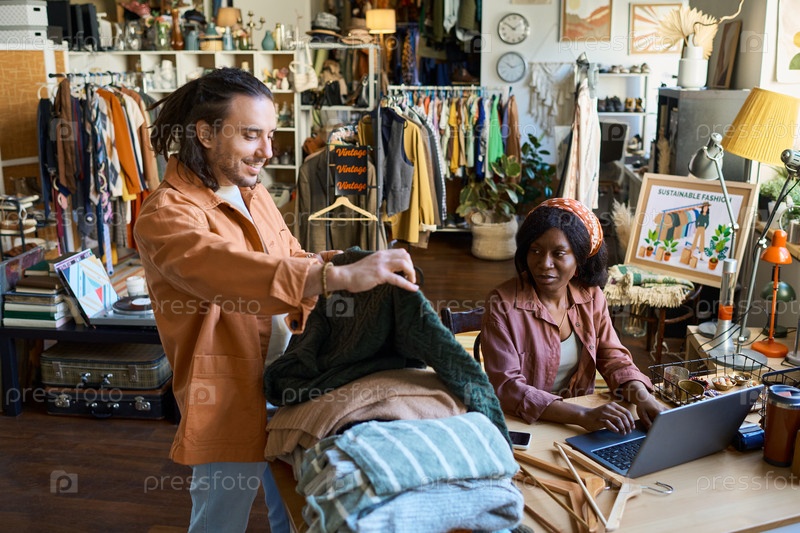 Молодой человек показывает одежду молодой чернокожей женщине, работающей в магазинчике