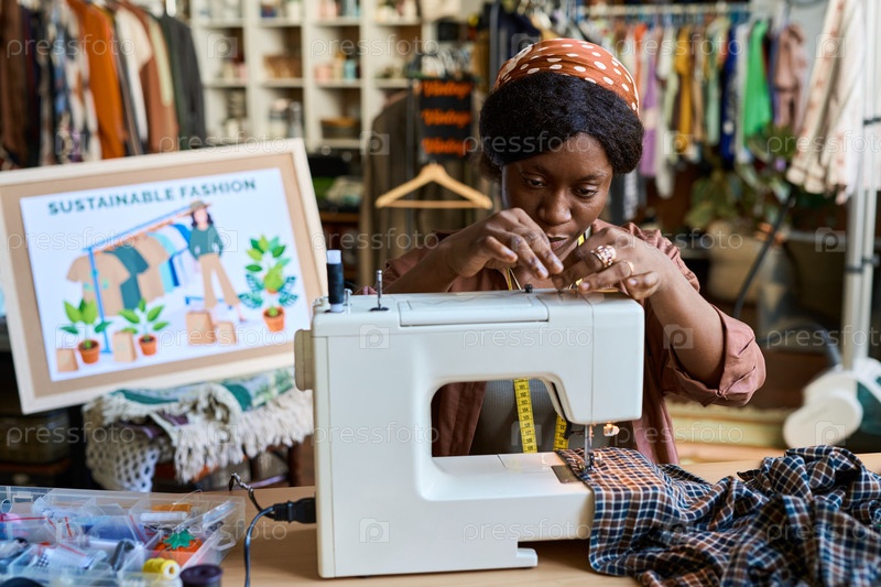 Молодая взрослая чернокожая женщина шьет одежду на машине, продвигая устойчивую моду