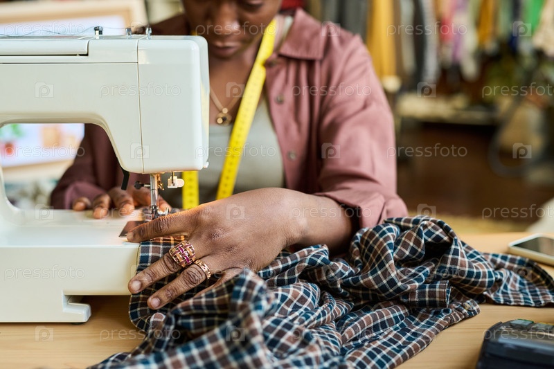Молодая взрослая чернокожая женщина шьет одежду с помощью машины в магазине монет