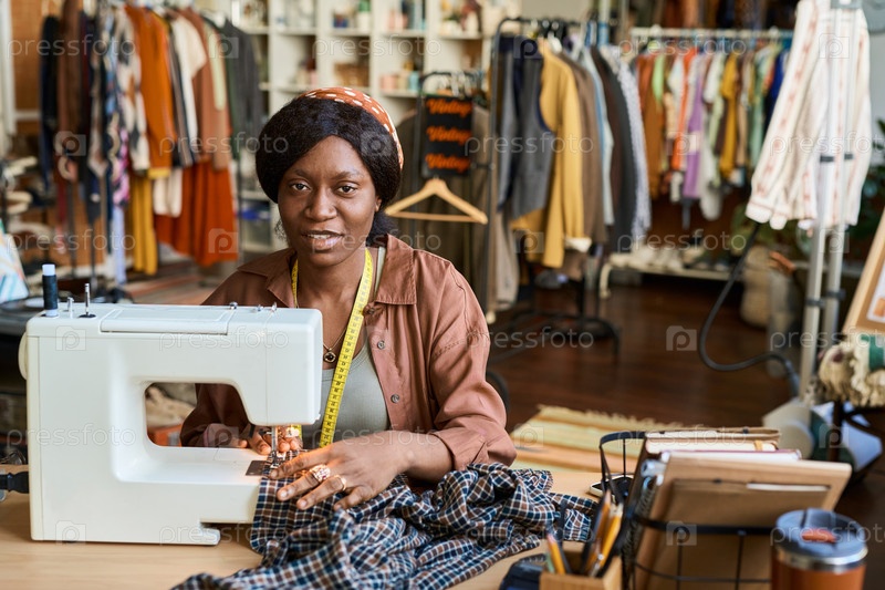 Портрет молодой взрослой чернокожей женщины, которая шьет одежду в магазине моды