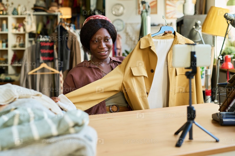 Молодая взрослая чернокожая женщина снимает магазин одежды с смартфоном