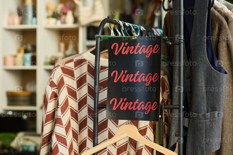 Винтажная одежда, отображаемая на стеллаже внутри среднего магазина