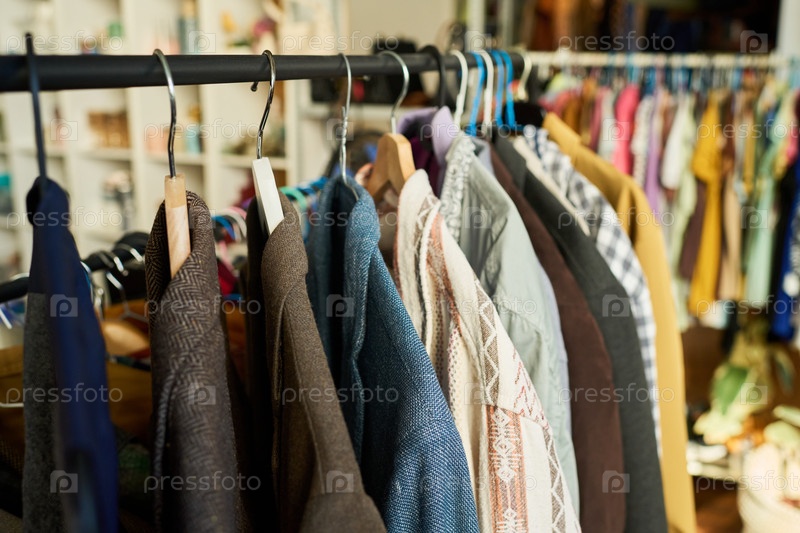 assorted Vintage Clothing Hanging on Rack in Thrift Shop Environment Ассортимент старинной одежды, висящей на стеллаже в среде монетного магазина