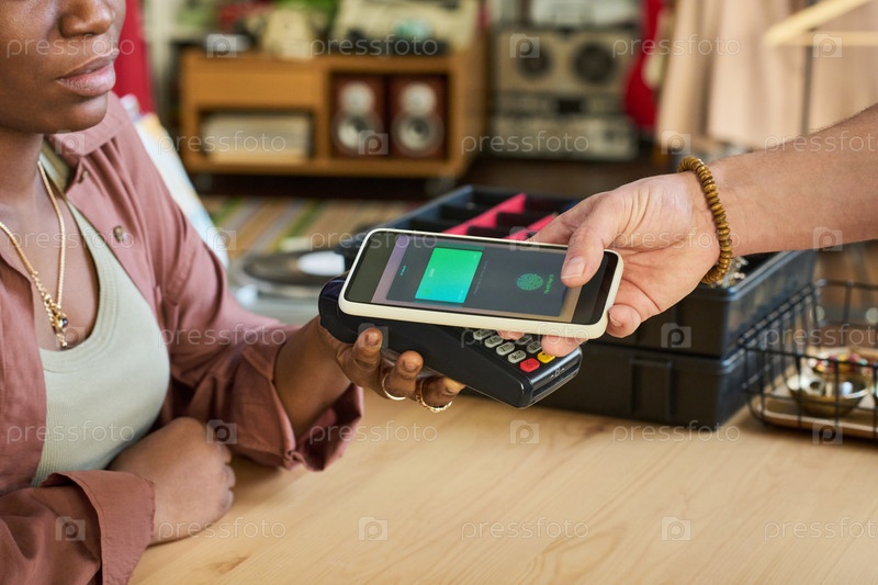 Молодая взрослая чернокожая женщина принимает мобильные платежи от мужчины в магазине