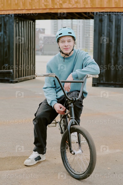 Портрет мальчика-подростка, сидящего на велосипеде Bmx и улыбающегося на открытом воздухе