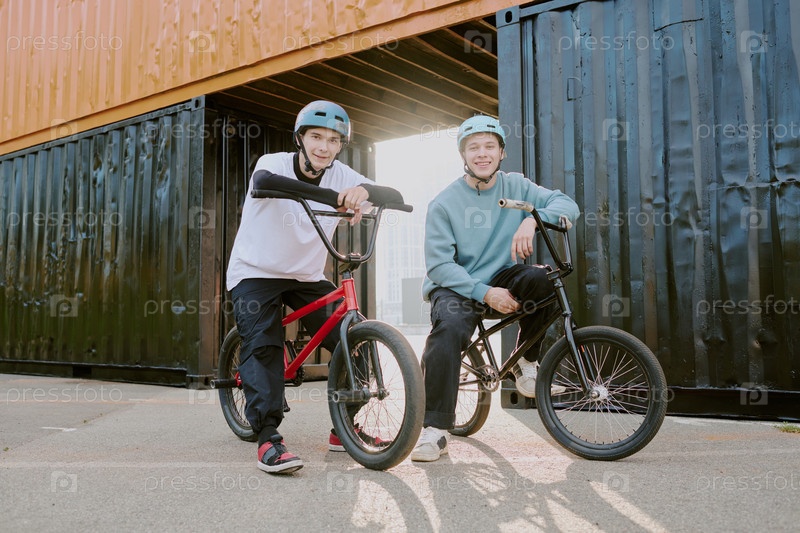 Мальчики-подростки улыбаются, пока позируют с велосипедами Bmx на открытом воздухе
