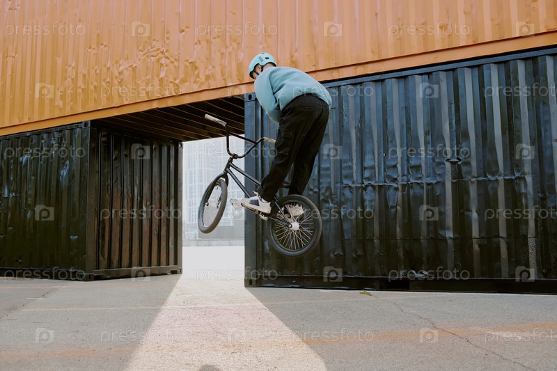 Мальчик-подросток исполняет Bmx Trick на открытом воздухе возле судоходных контейнеров