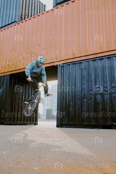 Мальчик-подросток выполняет Bmx трюк прыжка через контейнеры