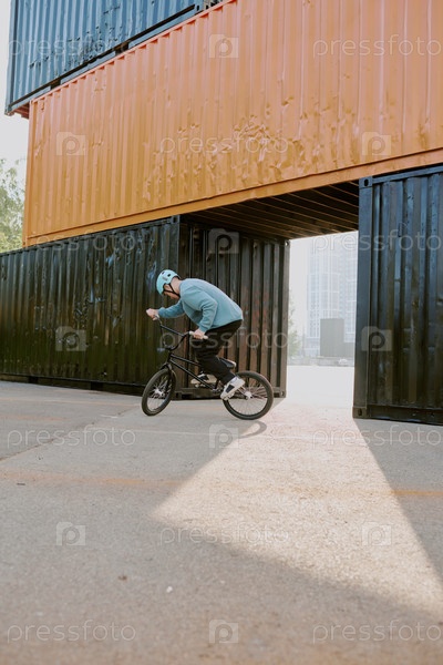 Подросток едет на велосипеде Bmx На открытом воздухе возле судоходных контейнеров