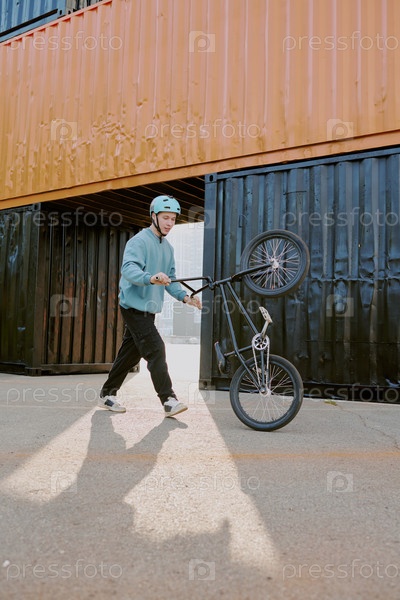 Мальчик-подросток выступает на велосипеде Wheelie На открытом воздухе возле судоходных контейнеров
