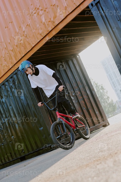 Мальчик-подросток едет на велосипеде Bmx На открытом воздухе под контейнером