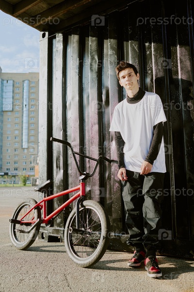 Портрет подросткового мальчика, стоящего с Bmx Bike Outdoors