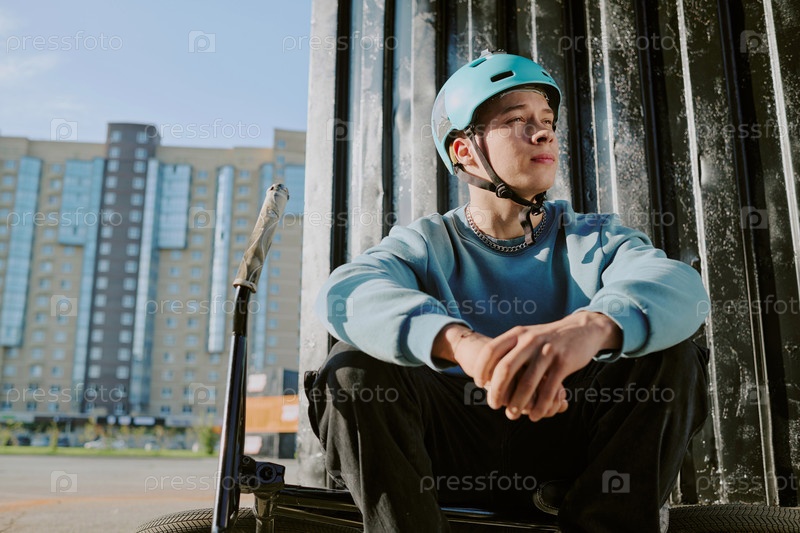 Портрет мальчика-подростка, носящего шлем, сидящего на улице и отражающего