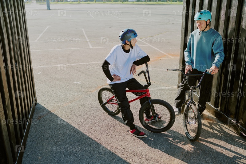Мальчики-подростки ездят на велосипедах Bmx и разговаривают на открытом воздухе в городской обстановке