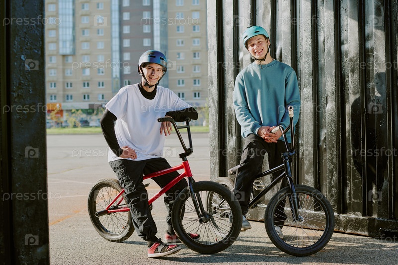 Два юноши-подростки улыбаются, пока позируют на велосипедах Bmx в открытом воздухе