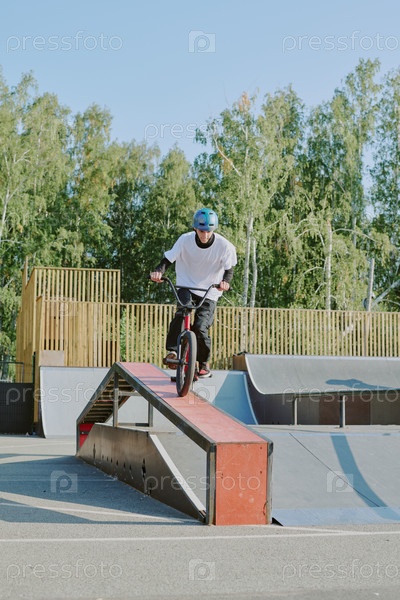 Мальчик-подросток едет на велосипеде Bmx на пандусе в открытом скейтпарке