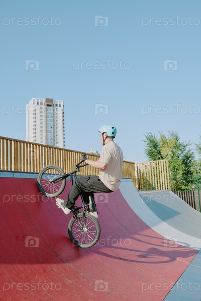 Подросток, едущий на велосипеде Bmx на пандусе в Urban Skatepark Outdoors