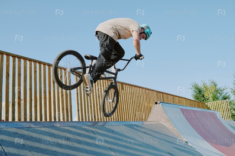 Подросток выполняет трюк Bmx на пандусе в открытом скейтпарке