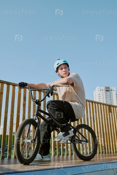 Мальчик-подросток едет на велосипеде Bmx в скейтпарке в солнечный день