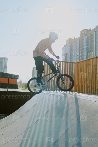 Подросток, едущий на велосипеде Bmx на пандусе в Urban Skatepark Outdoors