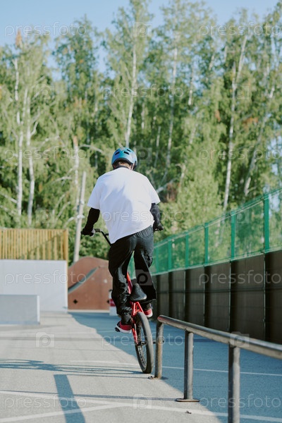 Юноша-подросток выполняет Bmx трик на скейтпарке в солнечный день на свежем воздухе