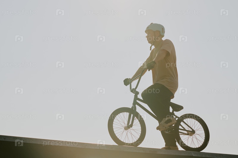 Подросток едет на велосипеде Bmx в открытом воздухе во время солнечного дня