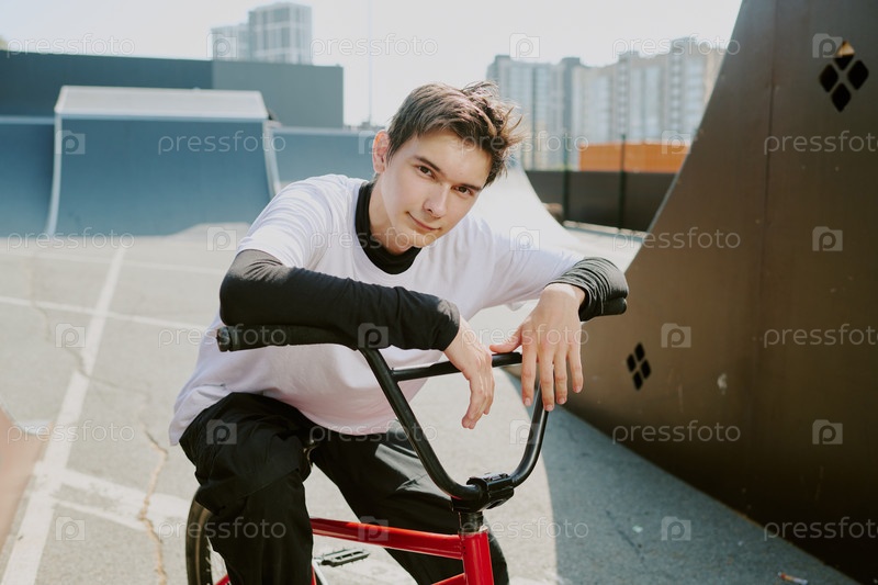 Портрет подростка, сидящего на велосипеде Bmx в городском скейтпарке