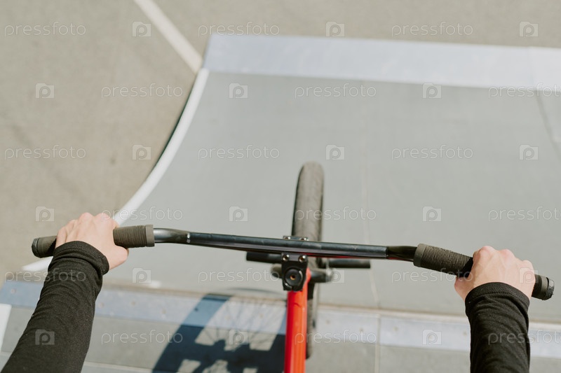 Мальчик, едущий на Bmx Велосипед вниз Скейтпарк Рэмп На свежем воздухе