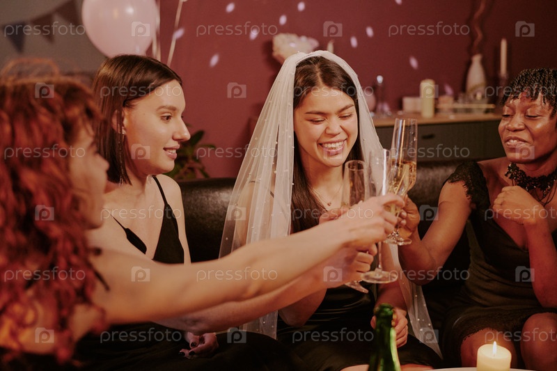 Мультиэтнические молодые взрослые женщины празднуют вечеринку бакалавриата, тостируя шампанским