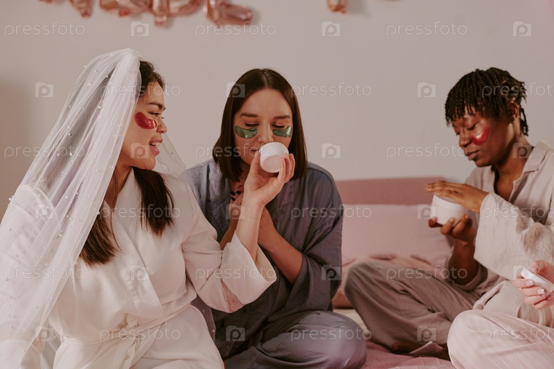 Молодые взрослые мультиэтнические женщины, наносящие маски для лица и расслабляющиеся на вечеринке бакалавра