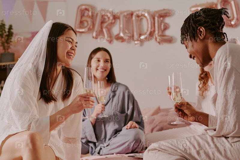 Мультиэтнические молодые взрослые женщины, смеющиеся и выпивающие шампанское на бакалаврской вечеринке